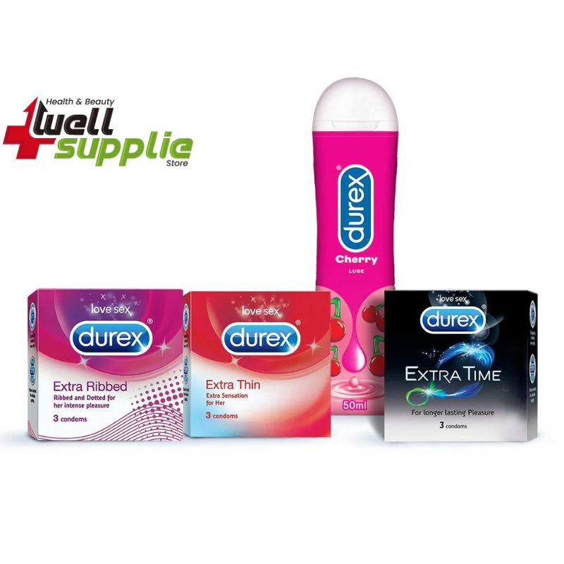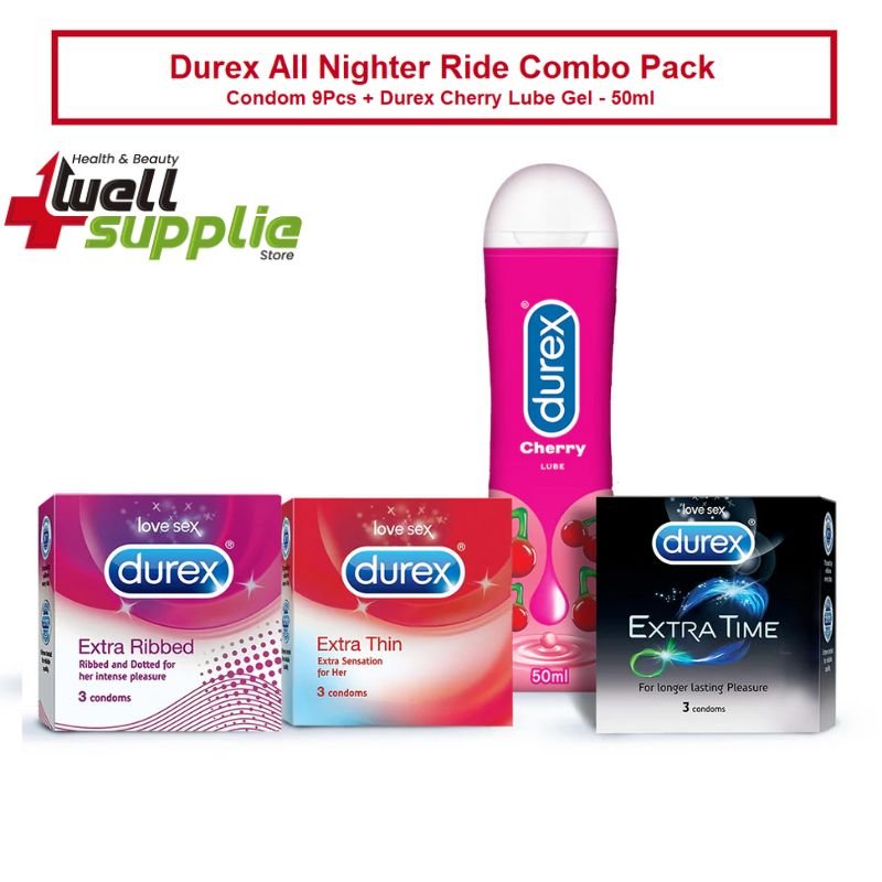 The Durex All Nighter Ride Combo Pack combines pleasure and protection with a selection of specialized condoms and a cherry-flavored lube gel. This pack includes nine condoms featuring different sensations: Extra Time for prolonged enjoyment, Extra Thin for heightened sensitivity, and Ribbed for extra stimulation. Complementing the condoms is a 50ml bottle of Durex Cherry Lube Gel, designed to enhance pleasure with its fruity flavor and smooth lubrication.